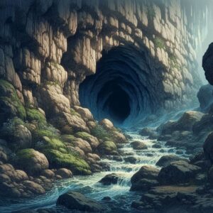 Podążając wzdłuż skalnej ściany otaczającej dolinę, na południowym zachodzie można natknąć się na cienka stróżkę prowadzącą do rozpadliny w zdawałoby się litej ścianie skał. To wejście do obszernej jaskini, wypełnionej przez krystalicznie czystą wodą. Woda w jeziorze, choć krystaliczna, nie pozwala dostrzec co znajduje się pod powierzchnią – a to z powodu panujących ciemności, czy rozmigotanego blasku w świetle przyniesionym przez drużynę. Jeziorko zajmuje większą część wnętrza i praktycznie w każdym miejscu ma podobną głębokość około 2 metrów. Jedynie wzdłuż prawej ściany można relatywnie wygodnie dotrzeć na przeciwległy kraniec jaskini.