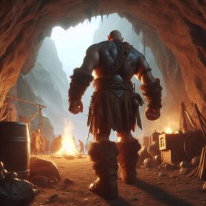 Wejście do pieczary jest z daleka widoczne na tle pionowych skał. Z odległości około 100 metrów daje się dostrzec wnętrze olbrzymiej jaskini, łącznie z jej mieszkańcami – czterometrowymi humanoidami, które szybko okażą się gigantami wzgórzowymi (samiec POZ 4, samica POZ 2 i młody samiec POZ 0).