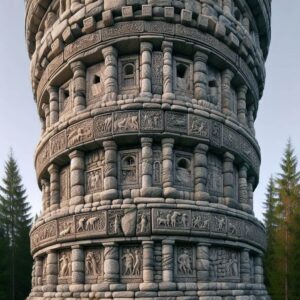 Na południowym skraju centralnej części doliny znajduje się misternie wykonana z ociosanych skał wieża. Jest ona całkowicie niemagiczna i pokryta płaskorzeźbami przedstawiającymi sceny z życia lasu, które wraz z upływem czasu utraciły już dawną ostrość i maestrię wykonania. Wysoka na dwadzieścia metrów i około 4 metrów średnicy u podstawy. Na wysokości około 8 metrów rozszerza się do średnicy 6 metrów, aby kolejne 6 metrów wyżej ponownie się zwęzić. 4 metry wyżej budowla ponownie się rozszerza i ciągnie na około 2,5 metra w górę, aż do szczytu. W tej ostatniej części znajdują się wąskie okienka, które przypominają otwory strzelnicze.