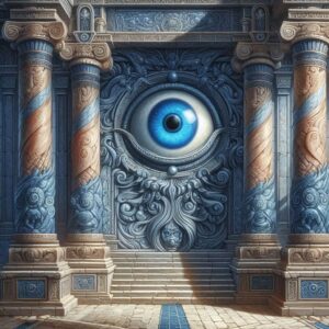 Na wschodniej ścianie świątyni znajduje się płaskorzeźba przedstawiająca oko o niebieskiej źrenicy. Każda istota, która zbliży się do niej na odległość mniejszą niż 100 metrów, naraża się na trafienie niebieskim promieniem, zadającym 10k10 obrażeń, ewentualnie połowę po udanym rzucie obronnym na odporność nr 9. Magia zawarta w płaskorzeźbie pozwala jej wystrzelić raz w rundzie i robi to tak długo, aż ofiara opuści jej zasięg, albo osiągnie stan agonalny. Do ściany budynku może zbliżyć się tylko osoba, która zasłoni się odpowiednio dużym lustrem lub srebrną wypolerowaną tarczą.