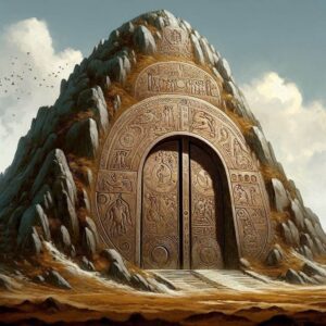 Na środku doliny znajduje się ciemny, pozbawiony roślinności pagórek, na którego stoku, od południa, znajdują się żelazne dwuskrzydłowe wrota. Każde skrzydło ma rozmiar 6 na 6 metrów i osadzone są w niemal pionowym w tym miejscu stoku. Ich powierzchnię zdobią płaskorzeźby, przedstawiające rytualne, dość makabryczne mordy składane w imię jakiegoś mrocznego boga. Postacie posiadające zdolność religioznawstwa dość łatwo mogą rozpoznać elementy wskazujące na kult Seta (bez potrzeby wykonywania rzutu). Każde skrzydło posiada otwór na klucz, który metodą prób i błędów można otworzyć każdym kindżałem.