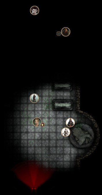 Nyress, Enitis i Ghrog chwycili skrzynię pełną zdobionych naczyń i wynieśli ją do pomieszczenia w którym stał posag jeźdźca. Ponieważ było tylko jedno źródło światła Belia, Eliminal oraz Erdal towarzyszyli im całą drogę. Skrzynia była ciężka więc pozostawili ją w komnacie i wzieli z niej duże naczynia. Dźwięk wody docierał z pierwszego korytarza na prawo od wyjścia z komnaty z wilkami. Były tam szeroko otwarte drzwi z symbolem wilka. Belia uniosła lampę aby poświecić do korytarza ale słabe światło nie zdradziło zbyt wiele. Przed nimi był mroczny korytarz a gdzieś głęboko w mroku ukryte było źródło dźwięku przypominającego deszcz.