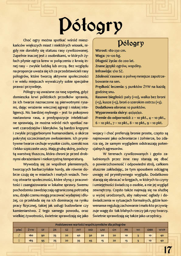 Jeśli ktoś chciałby wprowadzić tę rasę do KC, to oczywiście prędkość leczenia winna wynosić 5 punktów na 8 godzin snu, zaś obrona i wyparowania skóry są analogiczne do cech krasnoluda, czyli 5/20 (ale jeśli zostaną 10/40 to też nie będzie tragedii, gdyż rasy w KC nie były nigdy zbyt dobrze zbalansowane). Przy okazji dzięki dla wszystkich z discorda za pomoc, szczególnie dla czegoja za wymyślenie półogra.