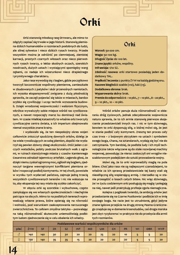 Nie mam prawa używać nazw własnych, poza tym nie do końca podobała mi się koncepcja wyglądu orków, więc tutaj pojawiają się pewne zmiany. Owszem, orki nadal kulturowo będą zbliżone do Azjatów, ale ich wygląd będzie bardziej spójny z powszechnym wyobrażeniem tej rasy. Także będą posiadały liczące się i olbrzymie imperium pod wodzą władcy-boga, ale będą dopiero w trakcie podbojów, co otworzy bardzo ciekawe możliwości pod kątem tworzenia kampanii wojennych oraz intryg politycznych.