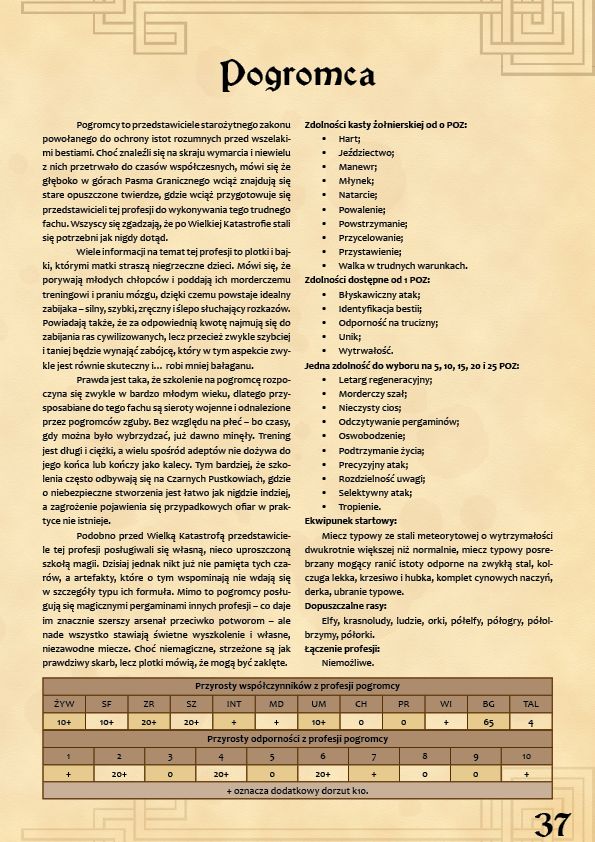 Na dzisiaj mam dla Was przykładową profesję, pogromcę, czyli odpowiednika wiedźmina (nazwa jest zastrzeżona). Nie będzie on aż tak przekokszony, ale wciąż jest naprawdę silną postacią dla doświadczonych graczy. Na 0 poziomie każda profesja otrzymuje 10 umiejętności kastowych (takich samych dla całej kasty), zaś na pierwszym dodatkowe 5 zdolności - tym razem już bardziej unikalnych. Od tej pory, co 5 poziomów (od 5 do 25) postać wybiera dowolną umiejętność z dostępnej puli - tak że kształtuje swojego bohatera w dość indywidualny sposób. Dla przykładu - łowca może iść w stronę wojownika walczącego 2 broniami jednoręcznymi i ma ku temu umiejętności, albo - jeśli zechce tego gracz - w stronę łucznika z zupełnie innymi możliwościami. Jest oczywiście także opcja zrobienia postaci dobrej w jednym i drugim - ale już ciut słabszej w danym aspekcie od wyspecjalizowanego przedstawiciela tej profesji. W związku z tymi progami, na których otrzymuje się nowe umiejętności, system poziomów doświadczenia został tak skomponowany, aby ilość doświadczenia na 10 POZ w Kryształach odpowiadał w przybliżeniu 25 POZ w Cesarstwie. W obu przypadkach postacie po osiągnięciu tych progów będą posiadały po 20 umiejętności.