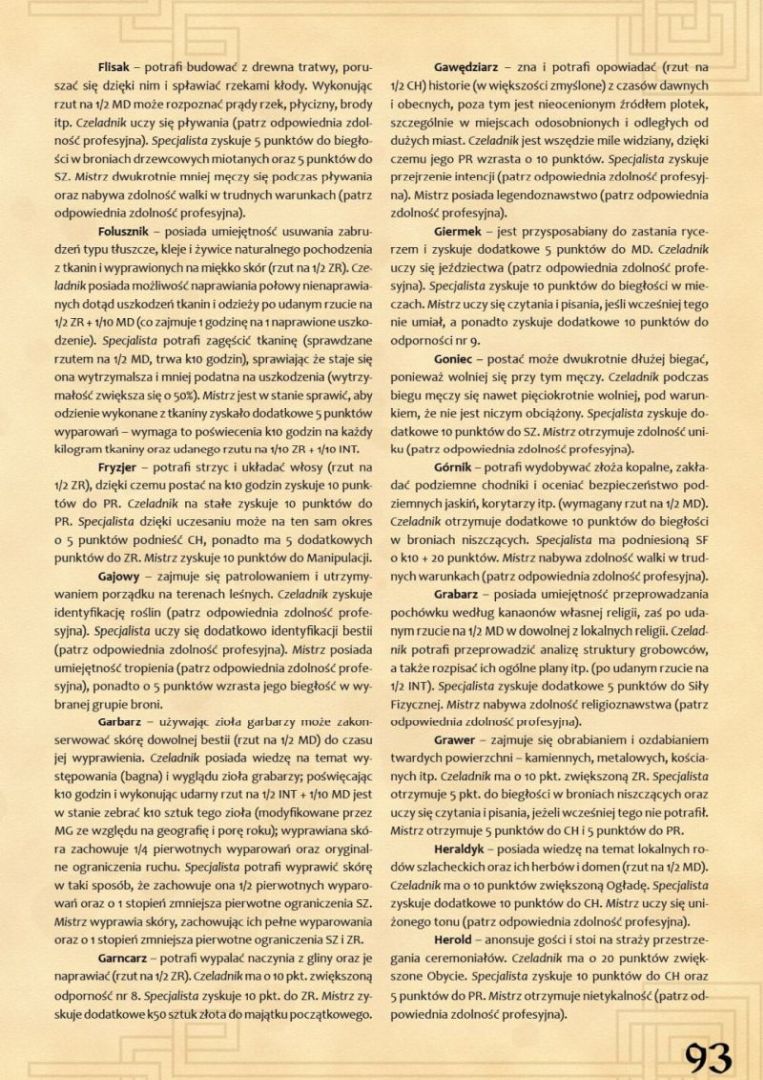 Okej, przyszła pora na zawody. Jak zapewne wiecie, każda warstwa społeczna będzie miała dostęp do 100 zawodów, zaś każdy zawód będzie dzielił się na 3 poziomy - czeladnika, specjalistę i mistrza. Każdy z tych poziomów daje jakieś profity - czasem bonus do współczynnika podstawowego, czasem do odporności, czasem umiejętność, rzadziej biegłość. Na przykład, problem jaki napotykałem w Kryształach - nie ma możliwości zidentyfikowania znalezionej mikstury - robi to tylko alchemik identyfikacją materii, ale umówmy się - któremu alchemikowi opłacałoby się otwierać kram z identyfikacją mikstur? Poza tym alchemików nie ma zbyt wielu. A dzięki temu każdy posiadający zawód aptekarza (na poziomie specjalisty) może posiadać tę umiejętność i odpłatnie świadczyć usługi identyfikacyjne. Podobnie z wieloma innymi zawodami i umiejętnościami. Jak zyskać wyższe stopnie specjalizacji? Trzeba ten sam zawód wylosować 2 lub 3 razy. W praktyce bardzo mało prawdopodobne, ale... Są jeszcze talenty, czyli odpowiednik kryształowych biegłości - być może komuś 2-3 biegłości w broniach wystarczą i zechce resztę przeznaczyć na zawody? Może to zrobić, tym bardziej, że grup biegłości w broniach będzie dużo mniej.