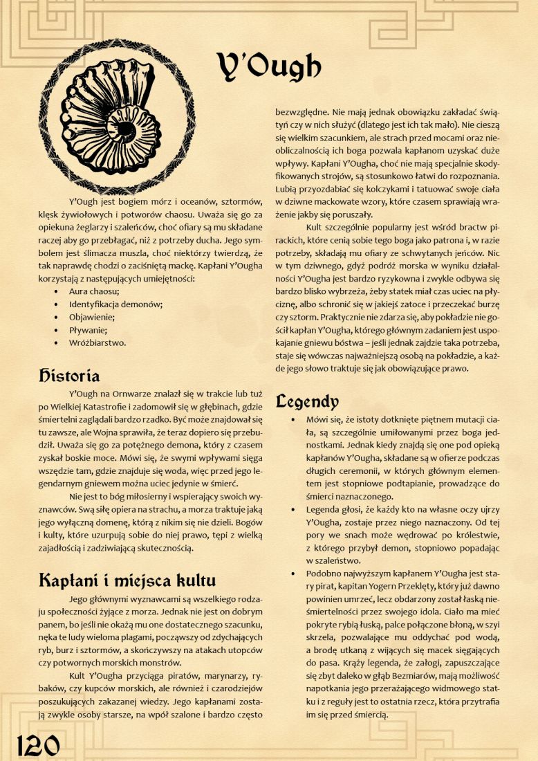 Tym razem parę słów o wierze. Panteon jest raczej młody, często wywodzący się od półbogów, i być może dlatego trzyma się raczej z dala od spraw śmiertelnych. Panuje tu monolatria - uznaje się obecność wielu bóstw, ale oddaje cześć tyko jednemu. Z tego też powodu ilość wyznawców bezpośrednio wpływa na siłę boga. Ogólnie głównych i opisanych bogów jest 12, oprócz tego krążą wokół nich inni bogowie, jednak jeszcze (albo już) nie posiadają takiej siły, aby wymieniać ich na równi z główną dwunastką. Oprócz tego miejscami wyznawani są lokalni półbogowie, wiec teoretycznie istnieje możliwość stworzenia takiego półboga, z interesującym gracza dogmatem, i zadeklarowania wiary właśnie w niego. Trzecią opcją, traktowaną raczej jako uzupełnienie świata, jest tzw. pogaństwo, czyli zespół kultów oddawanych pradawnym siłom i potężnym reliktom, które odżegnują się od wiary w bogów czy półbogów. Pogaństwo jest zakazane i zwalczane, może jednak stanowić ciekawe fabularnie źródło zagrożenia dla bohaterów czy świata.