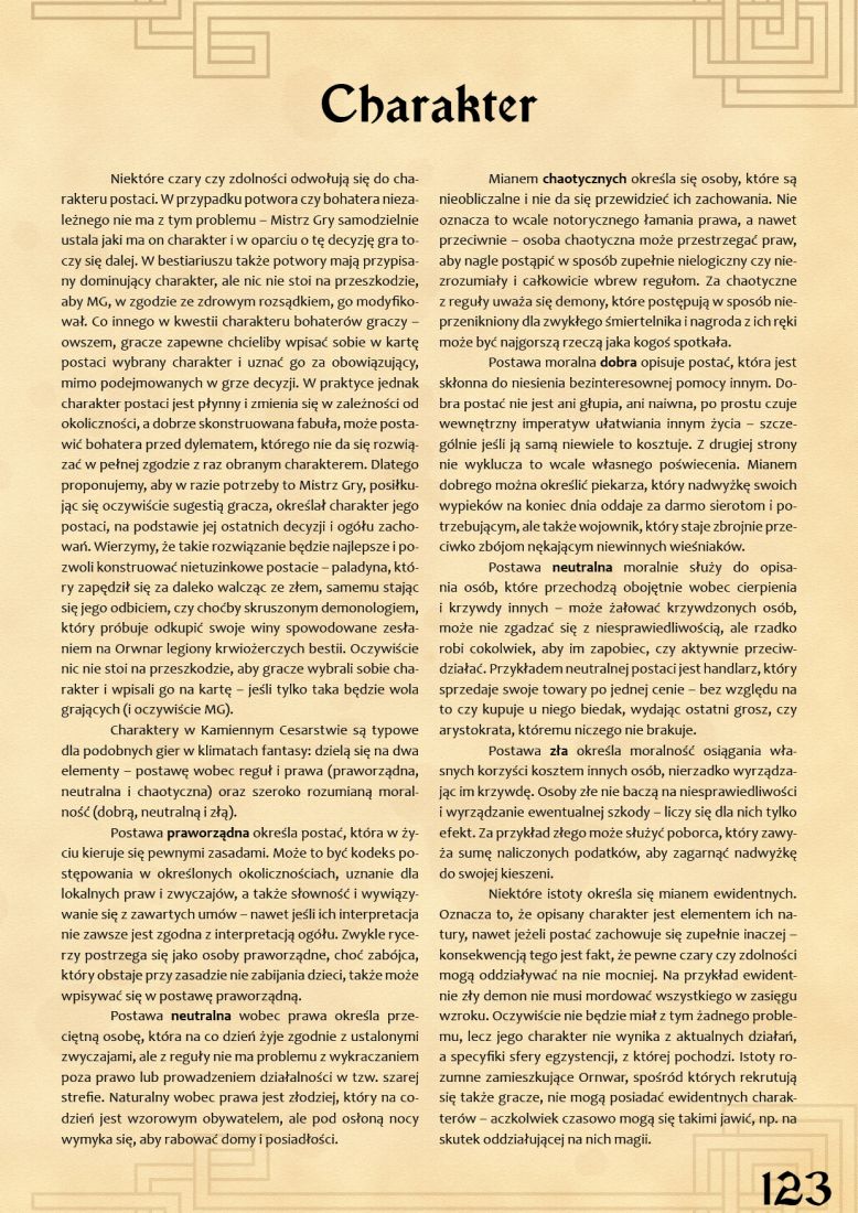 Jak zapewne zauważyliście bogowie nie mają na sztywno przypisanych charakterów. Jest to spowodowane faktem, że nie da się przypisać ludzkiego (śmiertelnego) rozumienia pewnych słów do zachowania bogów - czasami postępowanie boga może być zupełnie niezrozumiałe dla śmiertelnika, ale to wcale nie oznacza odstąpienia przez niego od posiadanej natury. Z opisów bóstw można wyczytać ich dominujące oblicze - np. Y'Ough będzie chaotyczny, a Gnomon neutralny. W przypadku bardziej skrajnych bóstw, ten charakter może nie być aż tak jednoznaczny, albo może zależeć od przyjętego oblicza bóstwa. Podobnie chciałem podejść do charakterów bohaterów graczy, dlatego niejako zrezygnowałem z deklaracji charakteru postaci, pozostawiając jego określenie Mistrzowi Gry w oparciu o czyny postaci. Oznacza to ze teraz nie powinno być sytuacji, że w jednej drużynie spotyka się paladyn i nekromanta i od razu się nienawidzą tylko z racji posiadanych profesji (a dokładniej: deklarowanego charakteru) Po prostu teraz, dopóki nie podejmą jakichś konkretnych działań, będą postrzegani neutralnie.