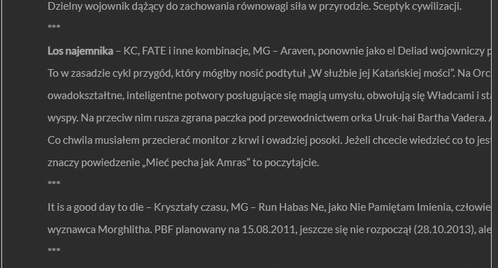 Super, wiem chyba co je nie tak, ale żebym się upewnił musisz mi podesłać jeszcze screen obejmujący obrazek karty postaci na tej stronie. Prawdopodobnie wrzuciłem tam za duże grafiki, które rozpychają tekst - tak po prawdzie to kwestia rozdzielczości Twojego ekranu, ale poprawię, jeśli mnie upewnisz, że grafiki też są rozepchnięte poza ramkę.