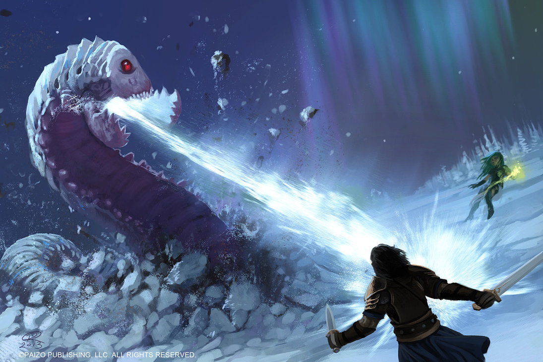 W razie potrzeby potrafią zionąć na ofiarę zmrożoną parą wodną, która jest w stanie unieruchomić ofiarę lub starają się zmiażdżyć ją za pomocą swego olbrzymiego cielska. Zwykle występują pojedynczo, a w pary łączą się na bardzo krótki okres godowy, ale nawet wtedy nie zdarza się, aby polowały wspólnie. Po godach obydwa osobniki (osobno) składają 3 do 5 jaj, które przysypane śniegiem lub uwięzione w lodzie pozostają praktycznie niewidoczne. Młode są pozostawione same sobie i po wykluciu pożerają się nawzajem, a przy życiu pozostaje wyłącznie najsilniejszy.