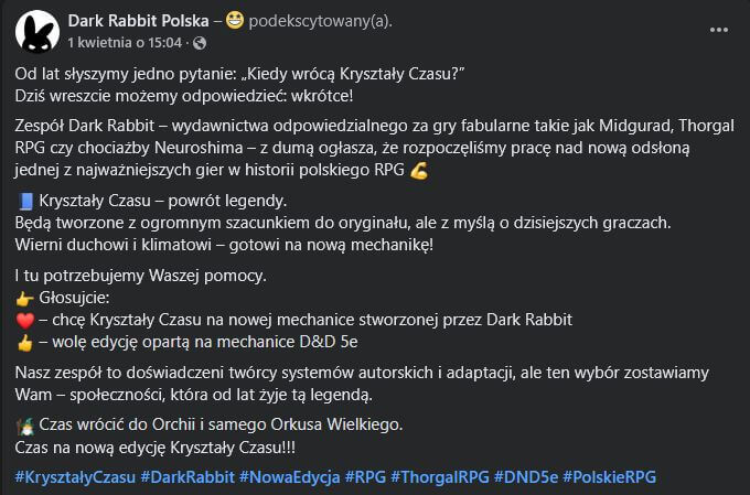 W Prima Aprilis roku 2025, wydawnictwo Dark Rabbit pozwoliło sobie na niewyszukany żart dotyczący nowej edycji Kryształów Czasu. Była to blaga, która mogła trafić tylko do wąskiego grona osób spoza fanów oryginalnego systemu, czemu od razu dano wyraz w komentarzach – bo przecież nikt nie uwierzy, że autor systemu, Artur Szyndler, odda prawa do marki po tym, co wcześniej spotkało czy miało spotkać jego samego i cały system.