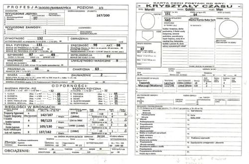 Żyw: 175 SF:226 ZR: 80(akt 20) SZ:83 (41) INT:74 MD:63 UM:38 CH:65 PR 83 WI:47 ZW:3