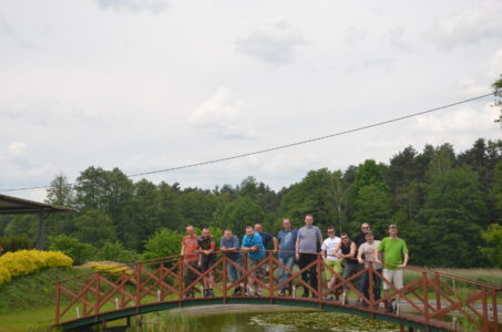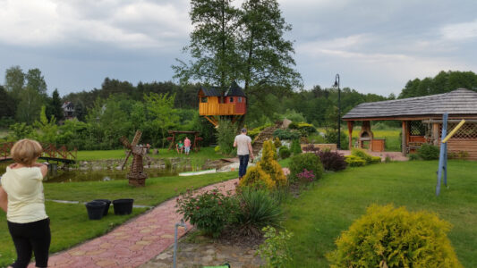 Położona niedaleko od Rawy Mazowieckiej Wólka Lesiewska powitała nas piękną wiosenną pogodą. Sielankowe wrażenie potęgowała soczysta zieleń roślinności, ptasie trele, łasząca się do ludzi kotka oraz kumkanie żab w stawie stanowiącym swoiste centrum atrakcji, które oferuje gospodarstwo agroturystyczne. Z obszernej altany mieliśmy dobry widok na dzieci, które zjeżdżały na linie ze zbudowanego specjalnie dla nich domku na drzewie.