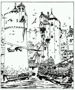 Skończywszy posiłek młodzieńcy złapali czym prędzej za wiosła, zanurzając rytmicznie ich pióra w chęci dotarcia do Ostrogaru przed pierwszymi promieniami słońca. Wszyscy byli rybakami od dziecięcych lat, toteż wysiłek fizyczny niezbędny do tej podróży ich nie przerażał, w każdym razie nie tak bardzo jak perspektywa ujrzenia wielkiego świata, o którego przepychu słyszeli czasami to i owo z ust przejeżdżających przez wioskę handlarzy i najemnych rębaczy.